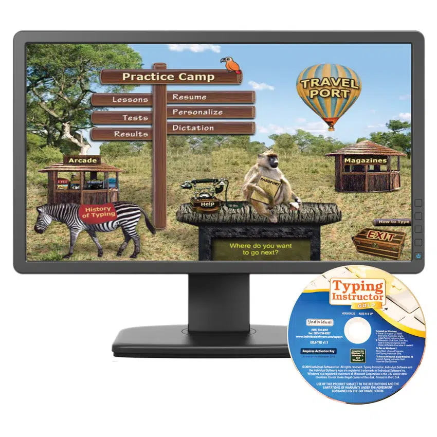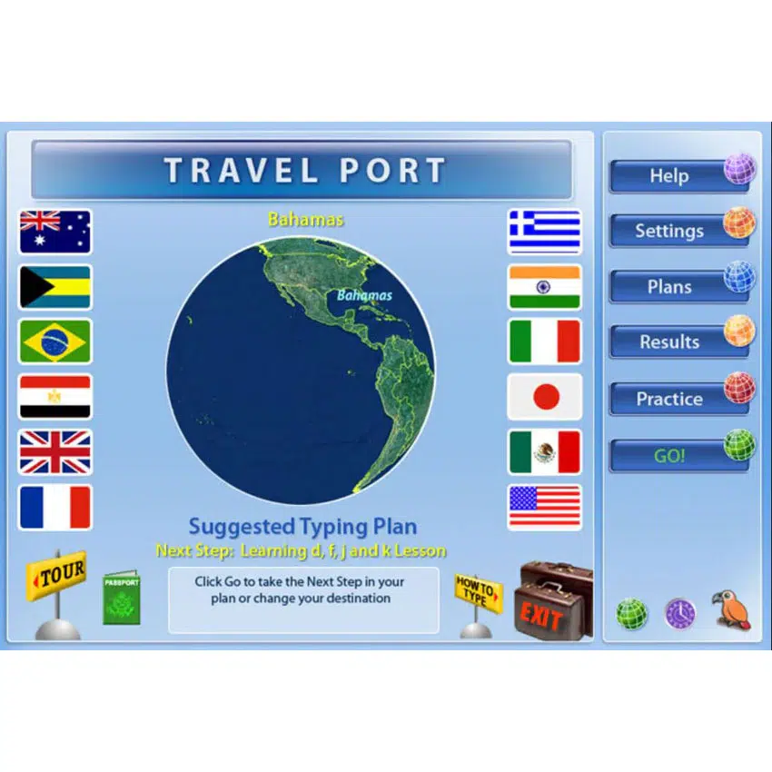 مغامرات وتحديات تفاعلية في Typing Instructor Gold تقدم أسلوب تعلم قائمًا على الرحلات عبر السفر حول العالم، عبور الزمن، ورحلات السفاري، حيث يتقدم المتعلم عبر محطات تدريبية تضم دروسًا واختبارات وألعابًا مرتبطة بالمفاتيح المتعلمة ويجمع طوابع في جواز السفر حتى إكمال المغامرة.
