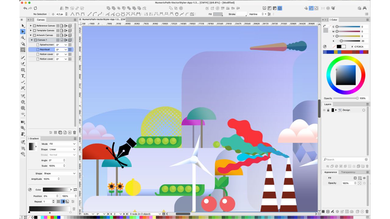 Affinity Designer: واجهة سلسة وأداء سريع جدًا في الملفات المعقدة، مع أدوات قوية للمتجهات والبيكسل، لكنه يفتقر لبعض الأدوات المتخصصة جدًا الموجودة في VectorStyler وIllustrator.