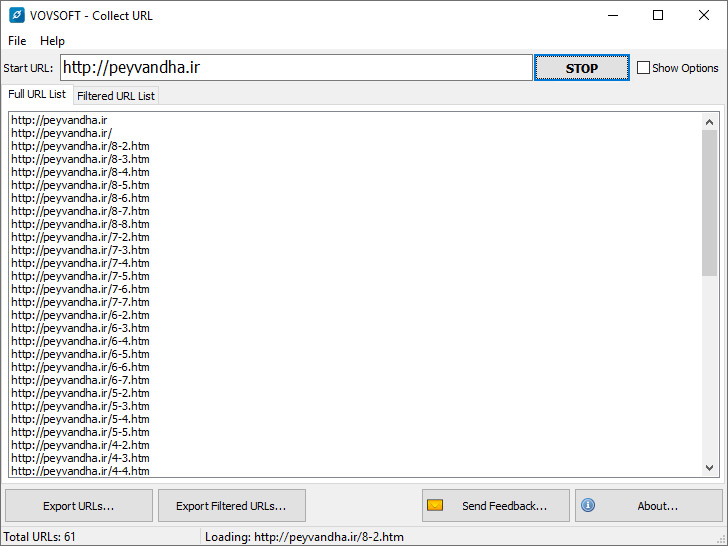 اضغط زر Start ليبدأ البرنامج في فحص الرابط، وستلاحظ امتلاء قائمة Full URL List تدريجيًا بالروابط التي يعثر عليها، مع إمكانية إيقاف الفحص في أي وقت بالضغط على Stop.