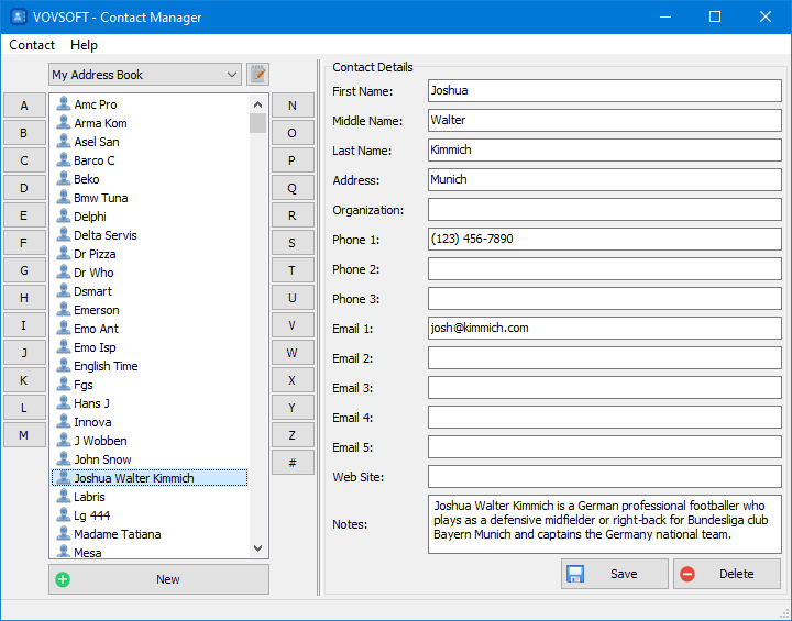 VovSoft Contact Manager هو برنامج سهل الاستخدام ومصمم لمساعدتك في تنظيم جميع جهات اتصالك في مكان واحد. يوفر البرنامج مجموعة من الميزات التي تجعل إدارة جهات الاتصال أكثر كفاءة وفعالية.