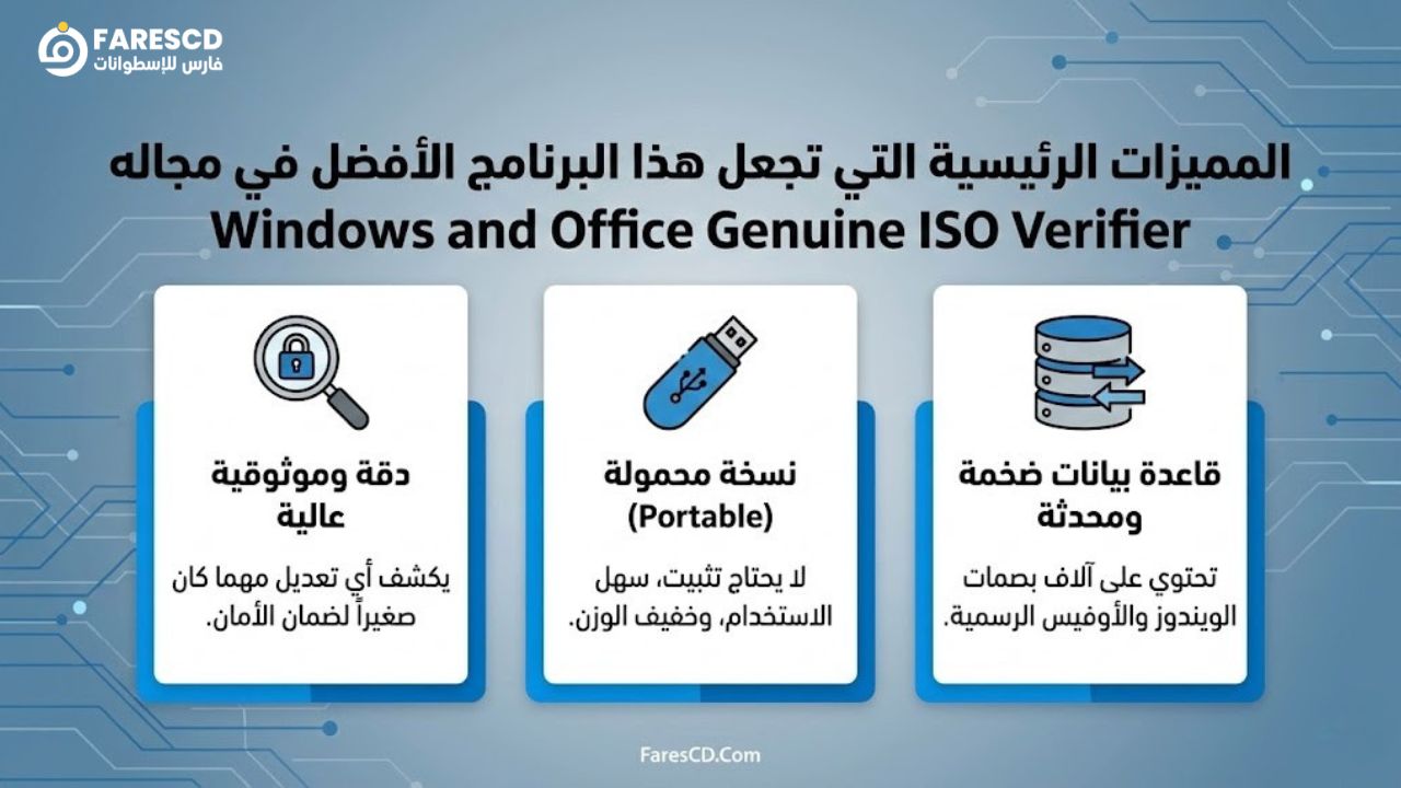 برنامج Windows and Office Genuine ISO Verifier هو أداة مجانية، صغيرة الحجم، ومحمولة (Portable) – أي لا تحتاج إلى تثبيت – وظيفتها الأساسية هي فحص ملفات الصور (ISO) الخاصة بأنظمة تشغيل ويندوز وحزم برامج أوفيس.