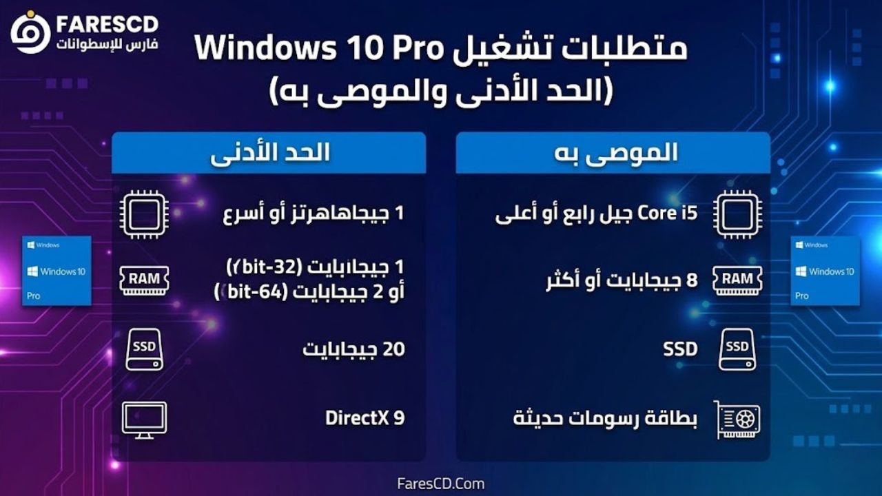 متطلبات تشغيل Windows 10 Pro (الحد الأدنى والموصى به)