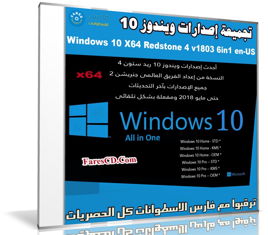 تجميعة إصدارات ويندوز 10 | Windows 10 AIO X64 RS4 | بتحديثات مايو 2018