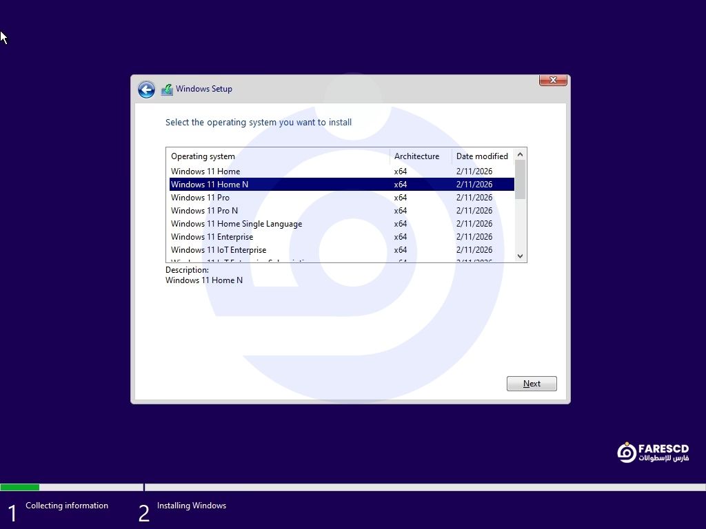 اتبع معالج الإعداد القياسي حتى انتهاء نسخ الملفات وإعادة التشغيل؛ لا حاجة لمفاتيح أثناء التثبيت في الحزم المفعّلة مسبقاً.