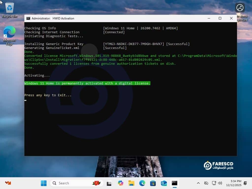 التعرف والتفعيل: بعد الدخول لسطح المكتب، سيتعرف النظام على الترخيص الرقمي تلقائيًا إن كان مرتبطًا بالجهاز، أو يمكن إدخال مفتاح صالح من “التنشيط” في الإعدادات عند الحاجة.