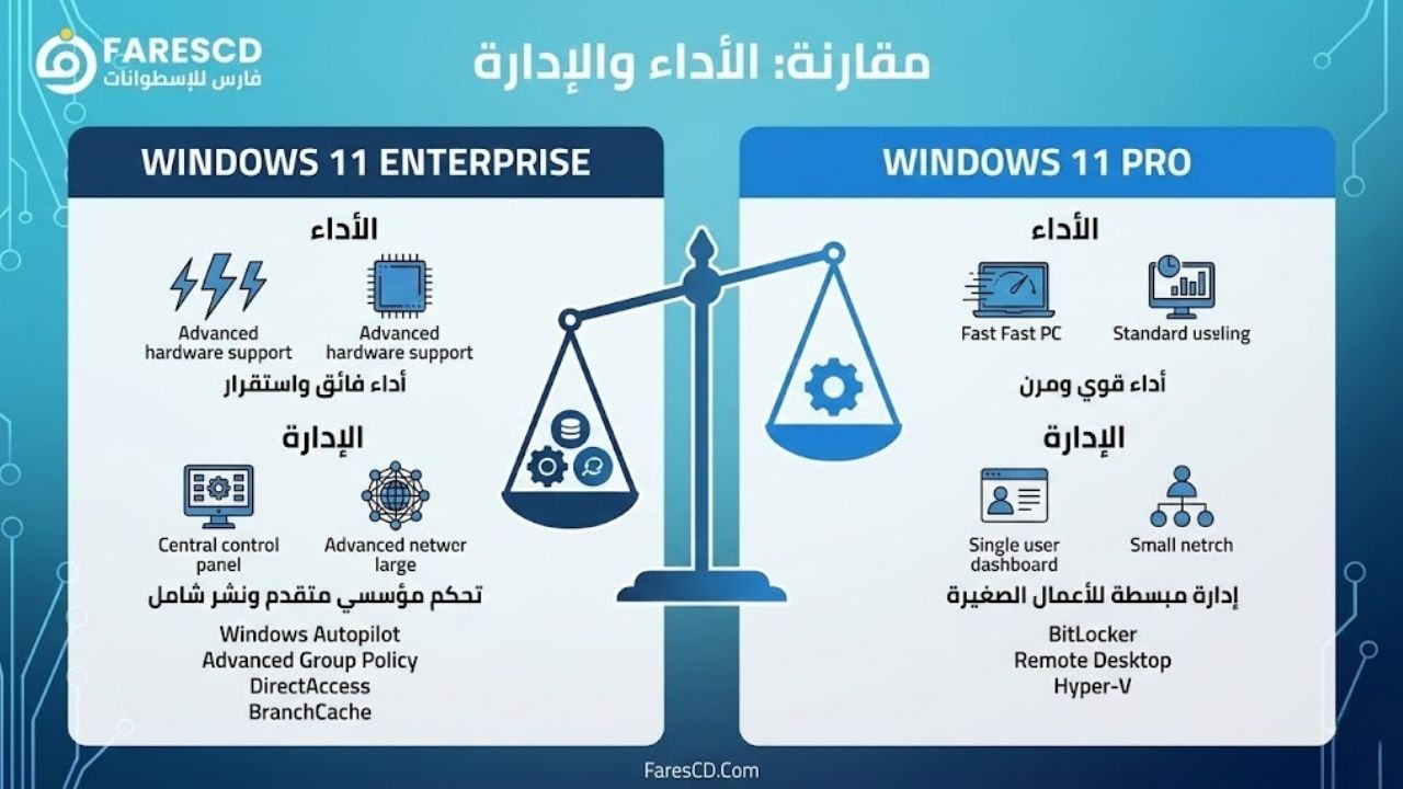 Windows 11 Enterprise يتفوّق في الإدارة والأمان على نطاق المؤسسة بينما يقدّم Windows 11 Pro أساسيات قوية للأعمال الصغيرة مع تقارب في الأداء على نفس العتاد عند المهام العامة، ما يجعل الاختيار مرتبطًا بحجم الأسطول ومتطلبات الامتثال والدعم طويل الأمد أكثر من كونه فرقًا خامًا في السرعة.
