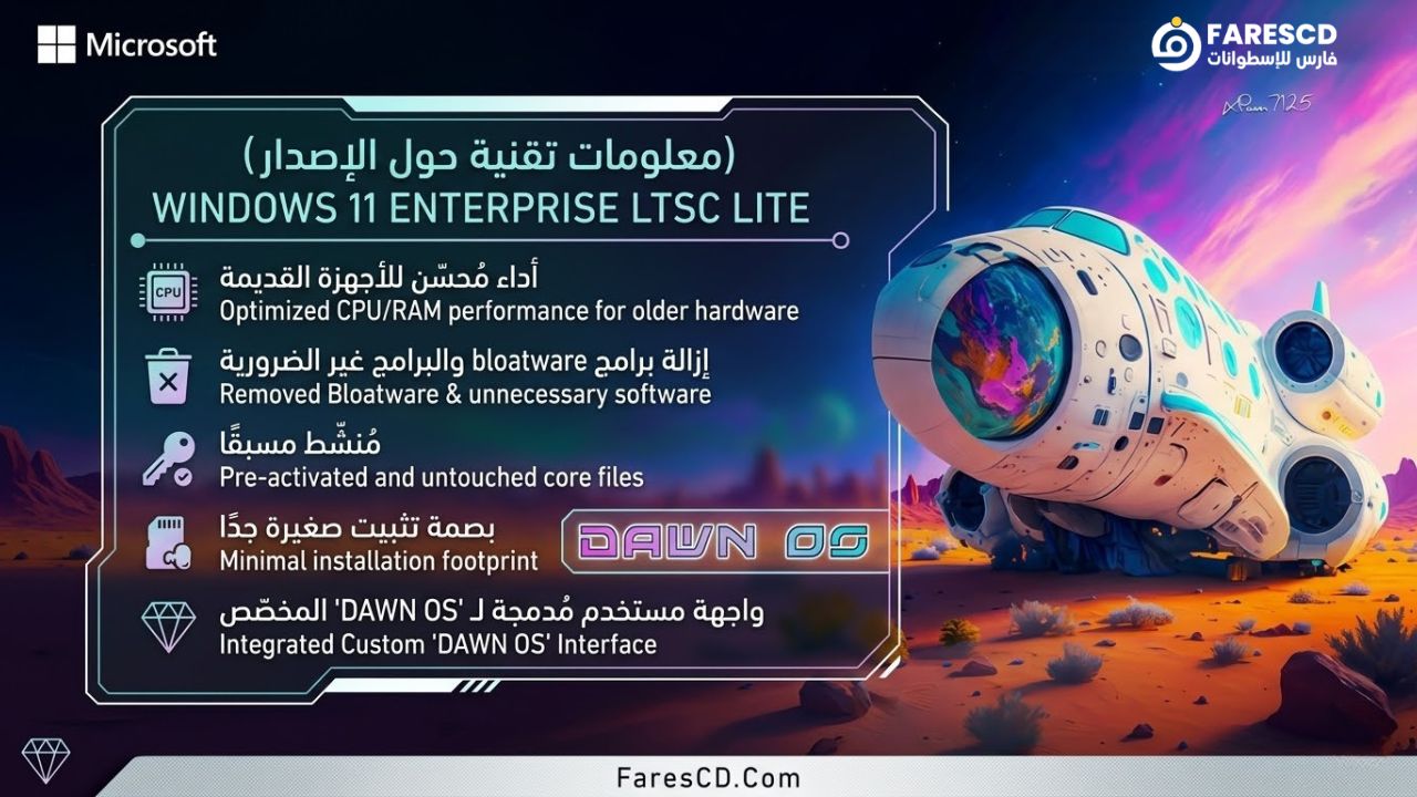 ويندوز Windows 11 Enterprise LTSC Lite 24H2 Dawn OS هو الحل السحري لمن يبحث عن أقصى درجات السرعة والاستقرار، خاصة لأصحاب الأجهزة الضعيفة والمتوسطة. تأتي هذه النسخة المخففة لتتخلص من كافة التطبيقات الافتراضية المزعجة والخدمات غير الضرورية التي تستهلك موارد الحاسوب، لتقدم لك نظام تشغيل نظيفاً ومبنياً على أحدث تحديثات مايكروسوفت. بفضل هذه التعديلات الذكية، ستحصل على بيئة عمل مثالية للألعاب، وبرامج الإنتاجية، والتصفح اليومي، مما يضمن لك أداءً صاروخياً دون الحاجة لتحديث قطع جهازك.