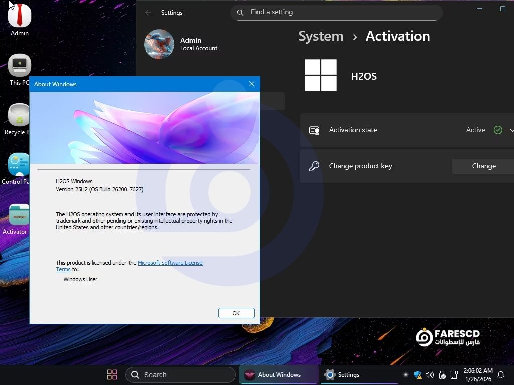 نسخة Windows 11 Pro 25H2 H2OS (Build 26200.7627) هي إصدار معدل ومحسن (Custom Build) من نظام التشغيل ويندوز 11 برو. تم تصميم هذه النسخة بهدف واحد: الأداء الخام.