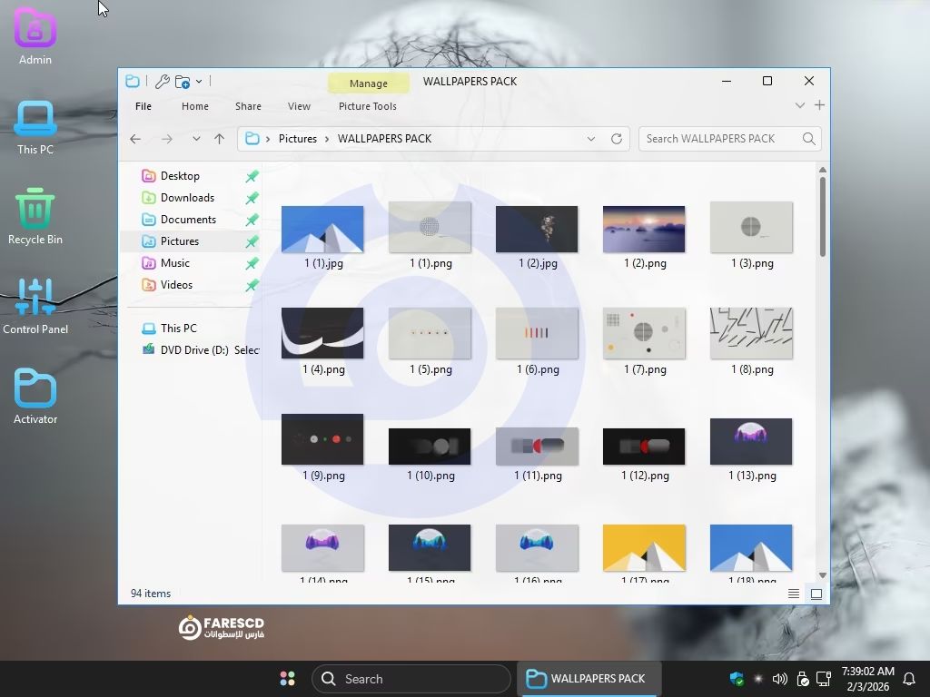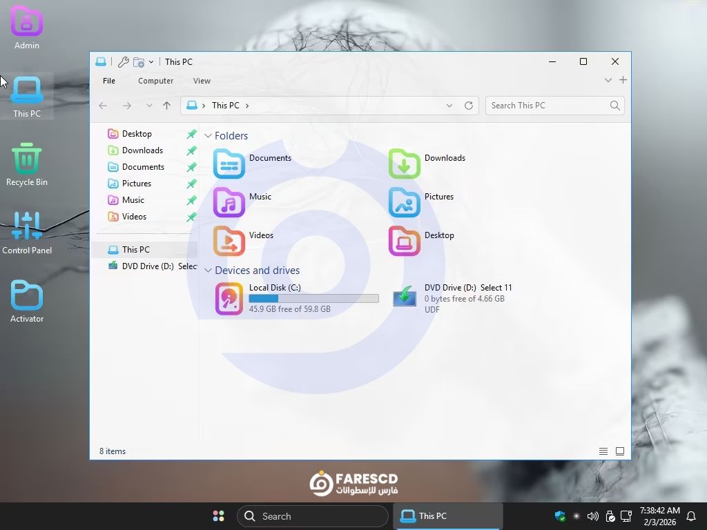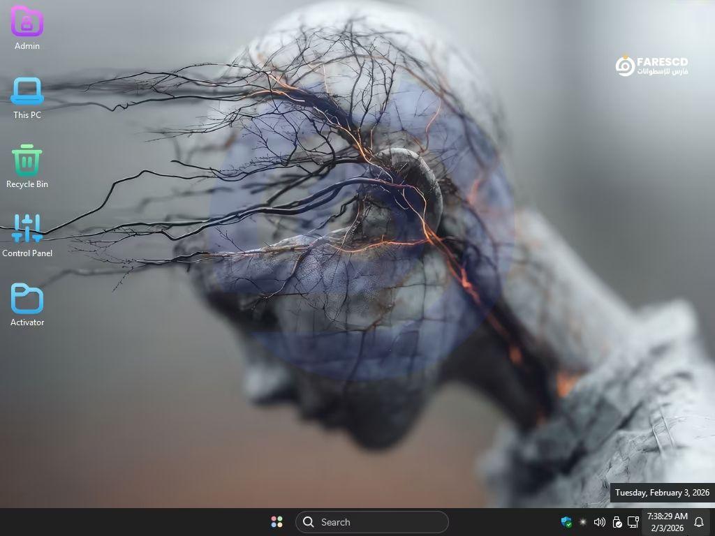 بعد التثبيت: بمجرد الوصول لسطح المكتب، انتظر قليلاً حتى تقوم السكريبتات المدمجة بتفعيل الإعدادات وتثبيت البرامج (7zip, StartIsBack).